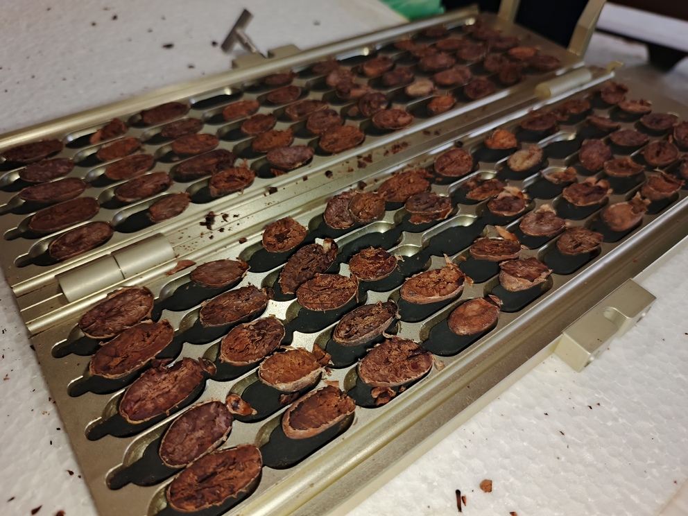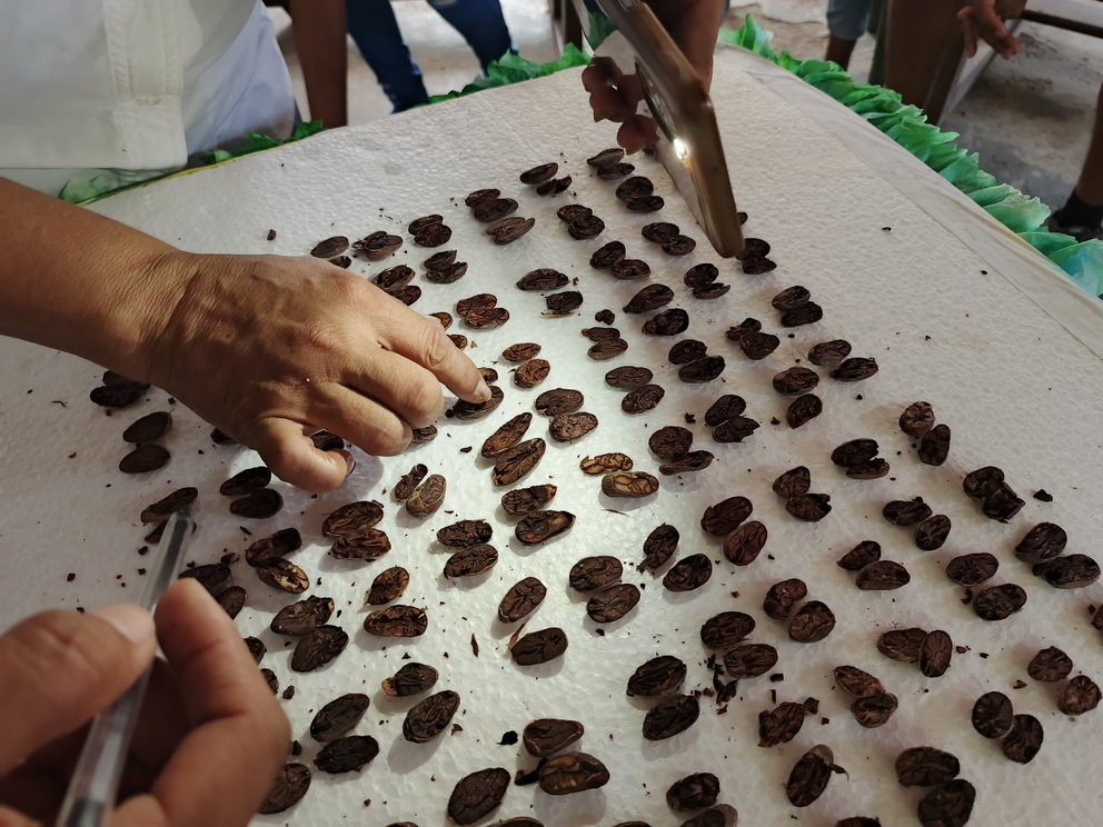 En el encuentro, se realizaron pruebas de corte de semilla para explorar la calidad del cacao, donde es posible observar el nivel de fermentación de los granos, uniformidad, color y defectos, así como reunir criterios técnicos que determinan la calidad comercial del cacao.