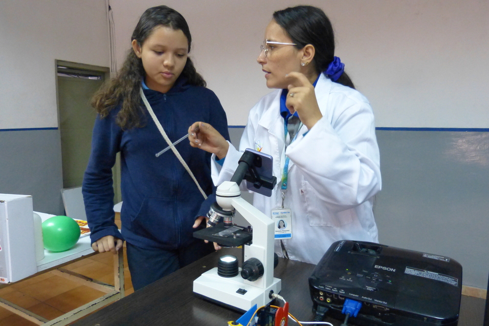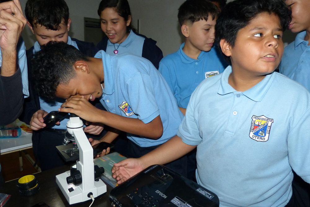 A continuación, Pimentel abordó los principios básicos de la microscopía, describiendo las partes y funciones de un microscopio monocular. Para hacer su presentación más interactiva, mostró a los estudiantes las partes de un abejorro, una escolopendra y restos de un panal, utilizando una lupa electrónica.