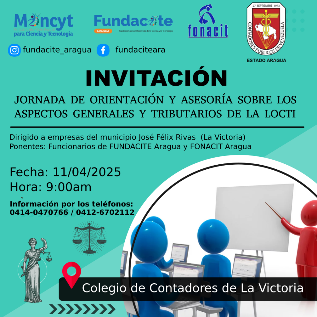 Te invitamos a la jornada de orientación y asesoría sobre los aspectos generales y tributarios de la Ley Orgánica de Ciencia Tecnología e Innovación, dirigido a empresas de La Victoria municipio José Félix Rivas, Aragua.
