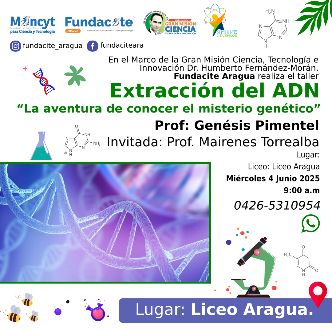 En el marco del Programa Nacional Semilleros Científicos, realizarán el Taller: «Extracción del ADN, la aventura de conocer el misterio genético”. Actividad promovida a través de la Unidad Territorial FUNDACITE Aragua.