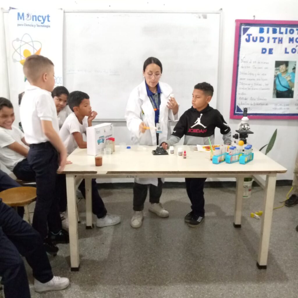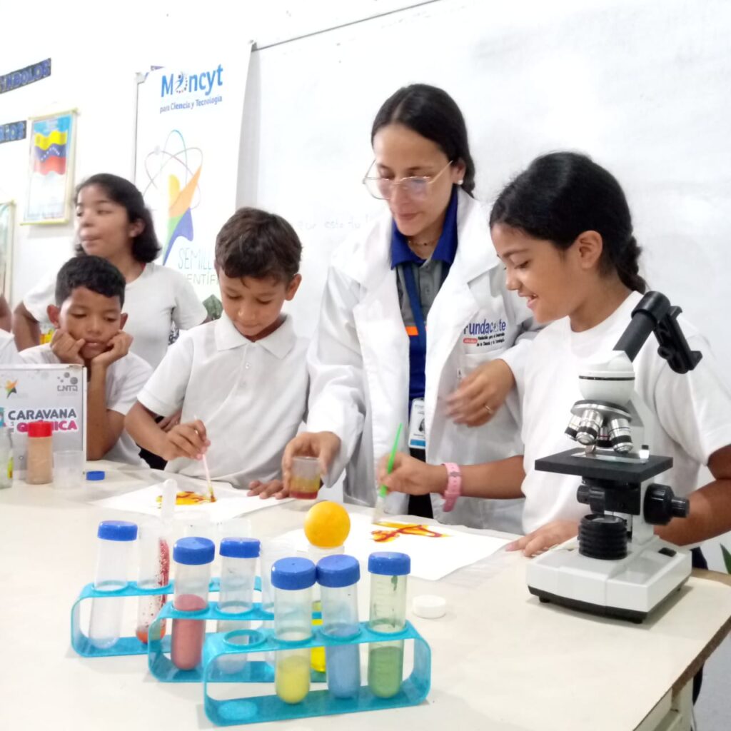 La jornada inició con experimentos dirigidos por la Prof. Génesis Pimentel, de FUNDACITE Aragua, quien enseñó a los niños y niñas conceptos básicos de química, como la densidad y los tipos de mezclas, utilizando el Kit de Caravana de la Química. Además, los estudiantes aprendieron sobre microscopía, conociendo las partes y el funcionamiento de un microscopio monocular.
