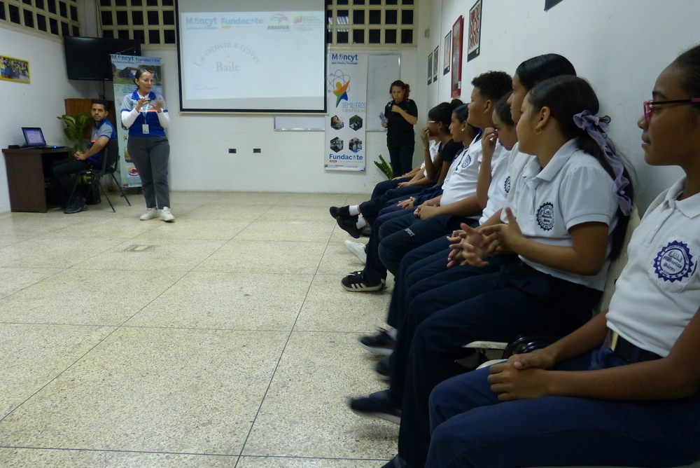 Se realizó el taller: “La ciencia a través del baile”, dirigido a estudiantes de las instituciones: U.E.N Manuelita Saenz, E.T.A Federico Villena y U.E.P Antonio Guzmán Blanco, en el Salón 13 de Abril de FUNDACITE Aragua, como parte del Programa Nacional Semilleros Científicos y la Gran Misión Ciencia, Tecnología e Innovación Dr. Humberto Fernández-Morán, impulsada por el Ministerio del Poder Popular para Ciencia y Tecnología y el Gobierno Bolivariano.