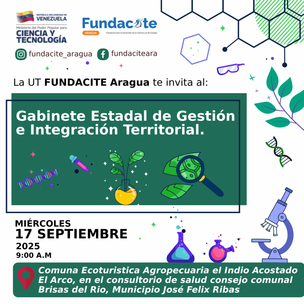 La Unidad Territorial FUNDACITE Aragua te invita a participar en el Gabinete Estadal de Gestión e Integración Territorial el MIÉRCOLES 17 SEPTIEMBRE 2025. 9:00 a.m