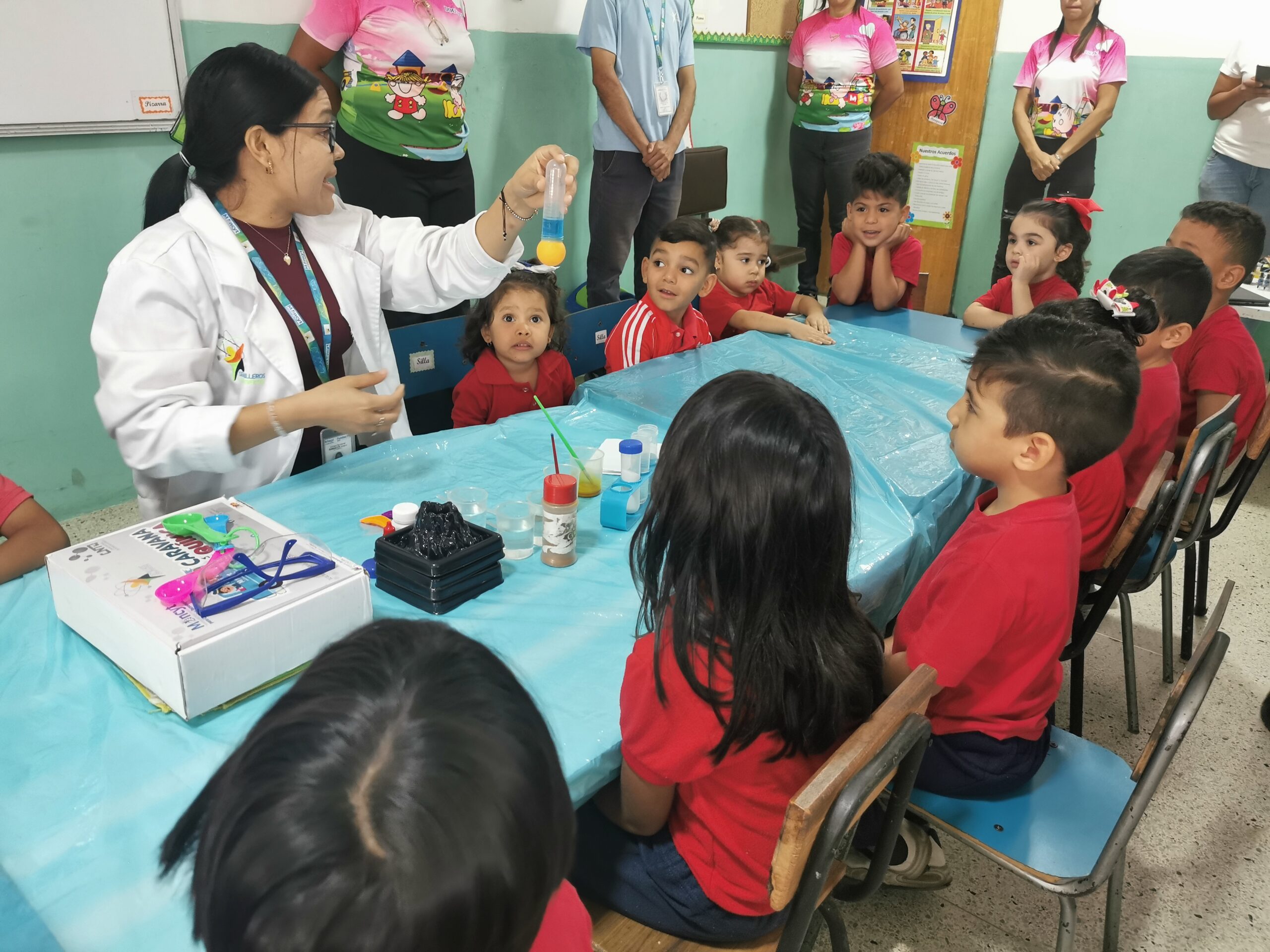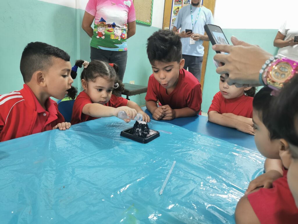 Desde el inicio, los niños y niñas participaron con entusiasmo en una serie de experimentos guiados por la profesora Josmagly Aular. Con el apoyo del Kit de la Caravana de la Química, la docente explicó de manera sencilla conceptos fundamentales como la densidad, los tipos de mezclas y la presión atmosférica, cautivando la atención de los presentes.