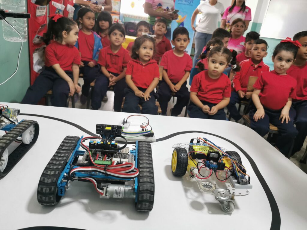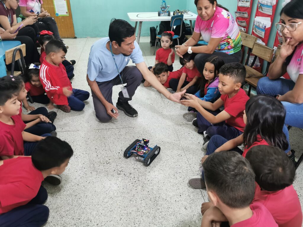 Posteriormente, el profesor Manuel Alvarado lideró un recorrido interactivo por el mundo de la robótica. Los pequeños conocieron las partes esenciales de un robot y sus distintas clasificaciones. El momento más llamativo llegó con la demostración de un robot poliarticulado seguidor de línea, cuyo funcionamiento y componentes fueron explicados de forma sencilla y didáctica, permitiendo que los niños y niñas comprendieran los principios básicos de la automatización.