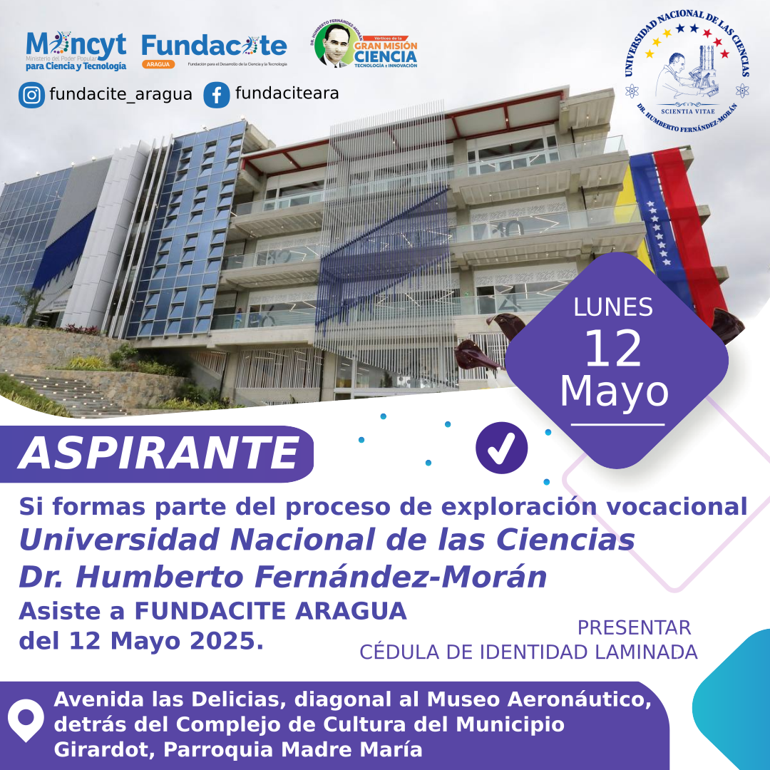 ¿Eres bachiller y te interesa estudiar en la Universidad Nacional de las Ciencias Dr. Humberto Fernández-Morán? Ven a FUNDACITE Aragua y participa en el proceso de exploración vocacional. 👩🏻🔬👨🏻🔬